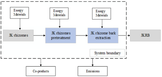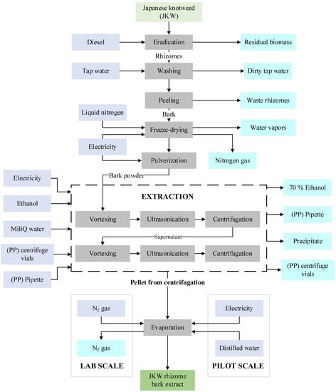 The JKRB extract production was considered for LCA analysis at both lab- and proposed pilot scales from cradle to gate. The system boundary, starting with the extraction of natural resource Japanese knotweed (JK) rhizomes and ending with the produced JKRB extract, is presented in Figure 1. For the system, a functional unit has been defined as 1 kg of produced extract at the lab and proposed pilot scales.