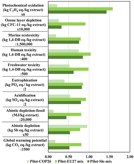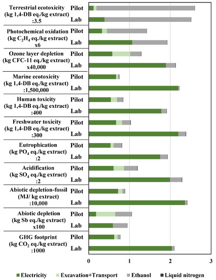 Environmental analysis was performed based on the experimental data for the lab-scale process and based on assumed modifications for the pilot-scale process. Cradle-to-gate analysis was performed, with the use of openLCA software [26] and the ecoinvent 3.7 [27] and Agribalyse 3.0 [28] databases. Based on the functional unit of 1 kg of produced extract, both scale processes were evaluated for their GHG footprint, abiotic depletion, abiotic depletion (fossil fuels), acidification, eutrophication, freshwater ecotoxicity, human toxicity, marine aquatic ecotoxicity, ozone layer depletion, and photochemical oxidation.
