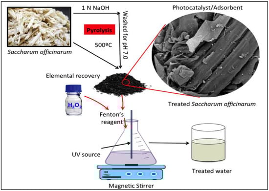 Agro-industrial waste residuals produced indiscriminately constitute extreme environmental pollution. However, currently, such waste is attracting researchers’ attention since it can be converted into wealth [,]. For instance, Gu et al. [] valorized sewage sludge to be used as a catalyst for wastewater elimination. Ullah et al. [] applied sugarcane bagasse to adsorb dye from an aqueous stream. Sugarcane bagasse, or Saccharum officinarum, is an agro-industrial waste by-product, and its lignocellulosic residuals have attracted scientists’ attention for their use as adsorbent materials []. Several authors have applied chemical enhancement to improve the activity of such materials [,]. Sun et al. [] enhanced Saccharum officinarum by etherification with extra stearic acid. Ahamad et al. [] washed Saccharum officinarum with NaOH and then sonicated it to improve its catalytic activity. Xiong et al. [] used various acids to treat such waste material. However, the use of Saccharum officinarum as an adsorbent material is not considered an ideal solution since it only transfers the pollutants’ phase, with no respect for their mineralization []. However, due to the chemical nature of modified Saccharum officinarum, which possesses several elements, as well as its reasonably high surface area [], it can be used as a photocatalyst.