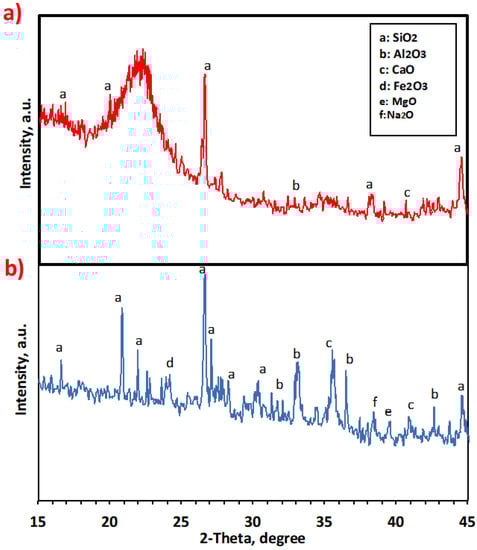 X-ray diffraction analysis was performed to investigate and evaluate the mineralogical composition of pure and treated Saccharum officinarum material, and the data are represented in Figure 2. The pattern displays the characteristics of the mineral. The XRD analysis shows that in terms of mineralogical composition, Saccharum officinarum consists of a bundle of minerals, and not only one mineral, as indicated by the various peaks for each mineral [,]. Various oxides identified in the XRD pattern of the treated Saccharum officinarum are Na2O, SiO2, CaO, MgO, Al2O3, and Fe2O3 (Figure 2b). The peaks at 2θ of 32.4, 37.1, and 43.1 indicate the occurrence of CaO [,]. In addition, the existence of quartz (SiO2) is signified by the peaks of 21.0, 21.4, 27.1, 37.2, 39.5, and 44.9 []. Na2O is specified by the 2θ value of 37.8.