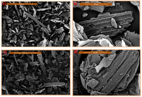Scanning electron microscope (SEM) images of pure native (a,b) and treated Saccharum officinarum (c,d) at different magnifications.