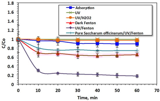 The data presented in Figure 4 indicate that the adsorption system had the lowest removal efficiency. The photo-oxidation system under UV illumination was more effective than the dark oxidation system. The data reveal that using Saccharum officinarum alone for treatment led to the removal of only 11% of the Bismarck Brown dye after 60 min of contact time. However, when Fenton’s reagent was added in the dark, the removal efficiency increased to 35%. When H2O2 was added to the wastewater under UV illumination, the removal efficiency increased significantly, to 82%, demonstrating the effectiveness of the Fenton oxidation reaction. The ˙OH radicals generated during treatment with Fenton’s were sufficient for attacking the dye molecules and converting them into harmless end products (CO2 and H2O). UV illumination in combination with Fenton’s reagent demonstrated a pronounced removal effect, possibly due to the additional reaction intermediates, ˙OH radicals, generated by the UV illumination. These findings agree with previous studies mentioned in the literature []. Furthermore, to verify the role of Saccharum officinarum, treatment using UV/H2O2 at a dose of H2O2 of 400 mg/L is carried out. According to the experimental data, only 3% of the dye is oxidized by using the solo hydrogen peroxide system. The data confirm the role of Saccharum officinarum and the effectiveness of Fenton’s reaction. This means that the production of ·OH radicals is limited compared to those generated from Fenton’s reaction. Furthermore, solo UV irradiance is applied, which removes only 1% of the dye. However, no Fenton’s reaction occurred in the case of the unmodified Saccharum officinarum since the oxidation efficiency is lower than that of UV/H2O2 treatment (only 26%). This treatment effect could be due to the hydrogen peroxide and UV, which are the main factors responsible for oxidation. However, the presence of untreated Saccharum officinarum renders the reaction since it is shadowing the UV light instead of leading to Fenton’s reaction. These results agree with the previous findings of Samet et al. [] in treating insecticide-containing wastewater through Fenton’s system.
