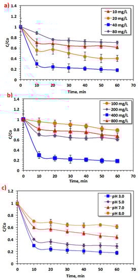 Wastewater pH is a vital factor in Fenton’s system. Taking this into consideration, the starting pH value for the aqueous solution was altered over the range of 3.0 to 8.0 since it shows a role in H2O2 decay and the hydrolytic speciation of the metal ions. The data displayed in Figure 6c reveal that the dye removal efficacy is highly correlated with the starting solution pH value and the optimal pH is recorded at 3.0. Unsurprisingly, the removal efficiency increases to 82% and declines with further pH increase. Moreover, increasing the alkalinity of the solution results in further reduction in the dye removal efficiency, to 39%. This might be because the fraction of soluble metal ions declines considerably with pH elevation. In addition, inactive hydroperoxide (HO2˙) radicals are formed in the oxidation medium, hindering the oxidation rate [].
