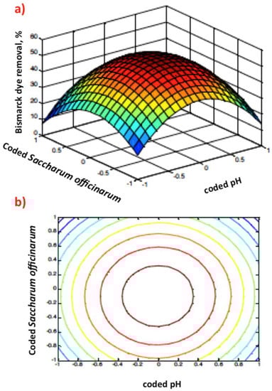 Figure 8a,b demonstrates via 3D response surface and contour plots the influence of Saccharum officinarum dose and pH. The graphical representation scheme verifies that the oxidation rates were enhanced with increasing the Saccharum officinarum dose. In addition, the acidic environment is favorable for dye oxidation and thus the optimum pH is in the acidic range. This could be explained by the existence of unfavorable radicals in the reaction aqueous solution media as the pH value increases, hindering the reaction rate.
