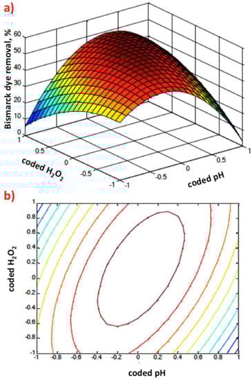 Graphical representation of Box–Behnken response 3D surface (a) and 2D (b) contour plots of coded pH value and hydrogen peroxide dose.