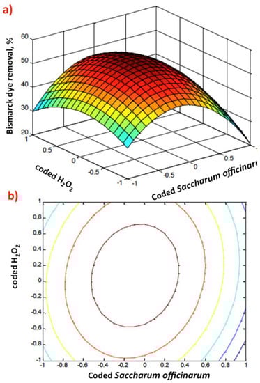 Figure 9a,b illustrates the relation of the coded values of Saccharum officinarum and hydrogen peroxide for dye oxidation. The 3D response surface and contour plots indicate that an increase in independent variables increases the removal efficiency. The surface and contour plots of the design display that the highest percentage of Bismarck Brown dye oxidation was attained at the junction near the origin of the two parameters. This investigation confirms the relation between reagent doses and the generation of ˙OH radicals. This oxidation methodology is highly cost efficient since it is based on a waste-originated catalyst.
