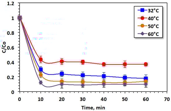 The data in Figure 10 display the positive impact of elevating the operating temperature on dye removal. Temperature elevation completes the reaction more efficiently. The oxidation efficacy improves from 82% to 90% as the temperature increases from 32 to 60 °C, probably because of the excellent production of hydroxyl radicals at high temperatures [] because of collisions between the dye particles in the aqueous medium. Moreover, temperature increase affects the reaction between H2O2 and metal ions originating from Saccharum officinarum, increasing the ˙OH output rate and accelerating Fenton’s reaction, leading to increased dye oxidation in the form of color removal [].