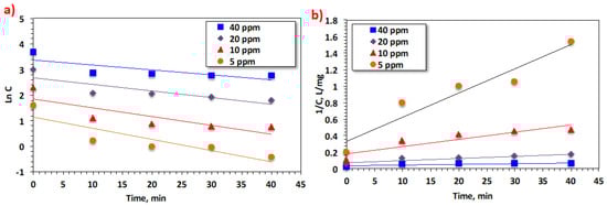 To further understand the modified Fenton’s reaction, the kinetics rates of first- and second-order reactions were investigated in accordance with the oxidation of Bismarck Brown via the photo-Fenton treatment system based on Saccharum officinarum particles. Such kinetic rate orders have been explained by the linearized form of such orders as displayed in Equations (13) and (14) for the first- and second-order reactions, respectively [,].