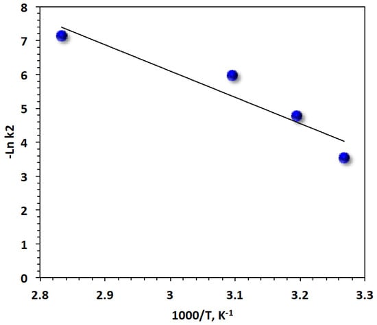 To understand the reaction for real applications, thermodynamic parametric values were calculated for a photo-Fenton oxidation system based on Saccharum officinarum. The activation energy (Ea) of the Brown dye oxidation can be calculated [] by using the Arrhenius equation revelation equation for the kinetic rate constant, , where Ris the universal gas constant value (8.314 J mol−1K−1), T is the reaction temperature in kelvin quantity, and Ais the pre-exponential constant. Then, taking the natural log of the Arrhenius formula and plotting versus 1000/T (Figure 12), a straight-line relationship is achieved where its slope could be used to calculate (energy of activation). The activation energy of the system was recorded at 64.43 kJ mol−1.