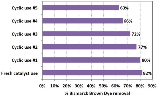 As shown in Figure 13, as the catalyst is used multiple times, its activity declines, as indicated by its oxidation efficiency. Compared to the oxidation efficiency of 82% when fresh catalyst is used, by the fifth cyclic use, its oxidation efficiency is reduced to 63%. In addition, the catalytic activity is reduced after each use as indicated by the decline in the removal efficiency, as seen in Figure 13. This might be attributed to the fact that pollutant intermediates cover the active centers of the catalyst, preventing them from attacking contaminates in wastewater. Hence, the overall reaction rate is reduced. It is worth mentioning the activity of the material is still high.