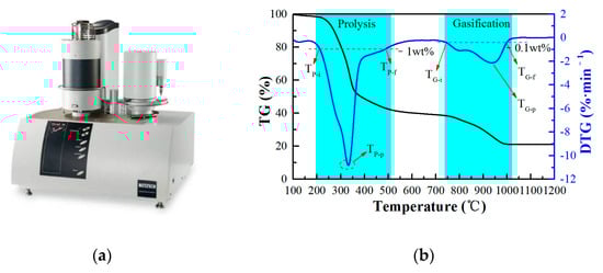 The experimental equipment for the co-gasification of sludge and biomass under CO2 atmosphere is a German NETZSCH thermogravimetric analyzer, as shown in Figure 1a. During the experiment, a total flow of CO2 gas controlled at 100 mL/min is introduced, and 10 ± 0.1 mg of samples are used for each experiment. The temperature range is from 50 °C to 1200 °C with a heating rate of 20 °C/min. The CO2-gasification process contains two main stages: the pyrolysis in the low-temperature region and CO2-gasification in the high-temperature region. In this paper, these two stages are separately studied and analyzed. For the pyrolysis stage in the low-temperature region, according to the thermogravimetric curve (TG) and the weight loss rate curve (DTG), the temperature when the DTG curve reaches −1 wt%/min at the reaction initial stage is defined as the pyrolysis reaction initial temperature TP−i, the temperature when the DTG curve reaches −1 wt%/min at the reaction final stage is defined as the pyrolysis reaction final temperature TP−f and the temperature when the DTG curve reaches the maximum is defined as the pyrolysis reaction peak temperature TP−p [18]. For the gasification stage in the high-temperature region, due to the relatively low-gasification reaction rate of chars, the temperature when the DTG curve reaches –0.1 wt%/min at the reaction initial stage is defined as the gasification reaction initial temperature TG−i, the temperature when the DTG curve reaches –0.1wt%/min at the reaction final stage is defined as the gasification reaction final temperature TG−f and the temperature when the DTG curve reaches the maximum is defined as the gasification reaction peak temperature TG−p [19]. The definition of characteristic temperatures is shown in Figure 1b. In addition, the average reaction rate DTGmean at the pyrolysis and gasification stages are also introduced to compare the reaction behavior quantitatively.