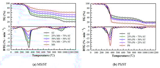 Figure 2 shows the TG and DTG curves of the co-gasification whole process of sludge (MS, PS), biomass straw (ST) and the mixture samples. It can be seen that there are two obvious peaks in the curves in the low-temperature and high-temperature regions. The former represents the devolatilization pyrolysis process and the latter represents the gasification process of the chars. Compared to the low-temperature pyrolysis reaction peak value, the chars gasification peak value in the high-temperature region on the DTG curve is relatively small, mainly due to the relatively low fixed carbon content.
