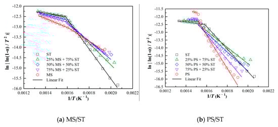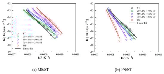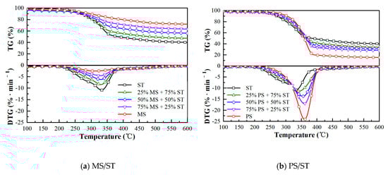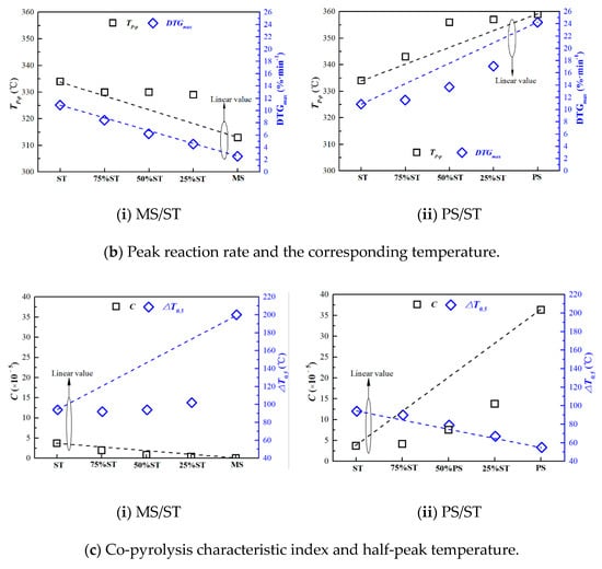 Figure 4b shows the peak reaction rates and the corresponding temperatures. The peak pyrolysis reaction rates of ST, MS and PS are 10.825%·min−1, 2.515%·min−1 and 24.06%·min−1, respectively. The corresponding temperatures for the peak reaction rates are 332 °C, 312 °C and 362 °C, respectively. For the MS-ST mixtures, the peak pyrolysis reaction rate and the corresponding temperature of the mixed sample gradually increase with an increase in the ST content. However, differing from the MS-ST mixtures, the peak pyrolysis reaction rate and the corresponding peak temperature gradually decrease with the increase in the ST content for the PS-ST mixture. This phenomenon is mainly caused by the difference in volatile content of ST, MS and PS. Figure 3c shows the characteristic index and half-peak temperature. The individual pyrolysis index C of ST, MS and PS are 3.731 × 10−5, 0.058 × 10−5 and 36.32 × 10−5, respectively. With the increase in ST content, the pyrolysis index C gradually increases for the MS-ST mixtures. In contrast, the pyrolysis index C gradually decreases in the PS-ST mixture. Moreover, the deviation between the experimental and the linear value is more obvious for PS-ST mixture, indicating a more intense interaction between the components. An interaction during the co-gasification process has been also observed [11]. For the MS-ST mixtures, the half-peak temperature significantly decreases as the content of ST increases from 0% to 25%. As it further increases from 25% to 100%, the half-peak temperature gradually decreases. For the PS-ST mixture, the half-peak temperature gradually increases as the content of ST increases from 0% to 100%. From the perspective of the pyrolysis index, the deviation between the experimental and linear values is more obvious for the PS-ST mixture than for the MS-ST mixtures.