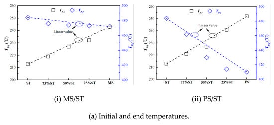 Figure 3 shows the TG and DTG curves of co-pyrolysis of sludge (MS, PS) and straw (ST) in the low-temperature region. The pyrolysis processes of MS, PS, ST and their mixtures have similar trends. Significant peaks on the DTG curves are observed and all mixed sample curves lie between the curves of pure samples. For MS-ST or PS-ST mixtures, as the ST content increases, the DTG curves at the initial stage gradually move towards the lower-temperature zone and at the final stage gradually move towards the higher-temperature zone. Figure 4a shows the initial and final temperatures (TP−i, TP−f) of the pyrolysis. The initial temperatures are obviously different for these three pure samples, mainly caused by the difference in volatile content (PS > ST > MS). The initial temperatures (TP−i) for ST, MS and PS are 213 °C, 243 °C and 252 °C, respectively, and the final temperatures (TP−f) are 484 °C, 475 °C and 410 °C, respectively. As the ST content increases in the mixture samples, the initial pyrolysis temperatures of the mixed samples gradually decrease. The experimental values are lower than the linear values, indicating that adding biomass straw promotes the pyrolysis of sludge. Meanwhile, the final pyrolysis temperatures of the mixed samples gradually increase as the ST content increases and the experimental values are lower than the linear values. Moreover, the deviation between the experimental and linear values indicates a certain interaction between the components. The deviation is more obvious for the PS-ST mixtures than the MS-ST mixtures.