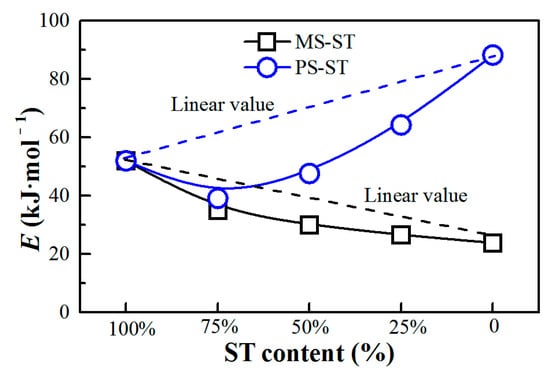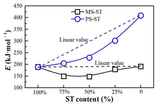 Table 2 shows the kinetic parameters at the pyrolysis stage. It can be seen that each linear quasi-correlation coefficient R2 is relatively high, indicating a good fitting degree. The activation energy is the following as a rule: PS > ST > MS. The average activation energy also exhibits a nonlinear change rule with changing the ST mixing ratio, mainly caused by the complex interaction between component samples during the co-pyrolysis process. For the MS-ST mixtures, the average activation energy gradually increases as the content of ST increases from 0% to 75%, and as it further increases from 75% to 100%, the average activation energy significantly increases Figure 6 shows the activation energy at the pyrolysis stage. Combining the characteristic parameters and activation energy in the low-temperature region, 25% of ST may be a reasonable mixing ratio for the MS-ST mixtures, which has a relatively low reaction temperature, relatively high pyrolysis index and low activation energy. For the PS-ST mixture, the average activation energy significantly decreases as the content of ST increases from 0% to 25%; as it increases from 25% to 75%, the average activation energy gradually decreases; as it further increases to 100%, the average activation energy increases again. Combining the characteristic parameters and activation energy in the low-temperature region, 25% of ST may be a reasonable mixing ratio for the PS-ST mixture, which has a relatively low reaction temperature, relatively high pyrolysis index and low activation energy.