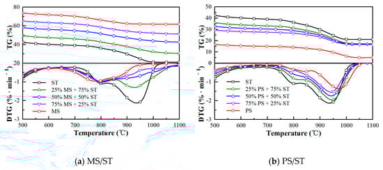 Figure 7 shows the TG and DTG curves of chars gasification of sludge (MS, PS) mixed with biomass straw (ST). It can be seen that there are relatively obvious gasification reaction processes of chars. The DTG/DTG curves of the mixture sample are between the DTG/DTG curves of pure samples. The non-additive rule can also be observed, indicating complex interactions between the components in the high-temperature region.