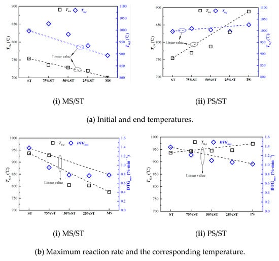 Figure 8a shows the initial and final temperatures (TG−i, TG−f) of the gasification reaction of chars in the high-temperature region. For MS and PS, the initial and final temperatures of the carbon residue gasification reaction show completely different rules. As the mixing ratio of ST enhances, the initial temperature of the co-gasification reaction gradually increases for the MS-ST mixtures but gradually decreases for the PS-ST mixtures; the final temperature of the carbon residue gasification reaction gradually increases for the MS-ST mixtures while it gradually decreases for the PS-ST mixtures. From the above two perspectives, in order to facilitate the gasification reaction occurring at lower temperatures, the mixing ratio of biomass straw ST should not be too high for the MS-ST mixtures. Nonetheless, the mixing ratio of biomass straw ST should not be too low for the PS-ST mixtures. At the same time, it can also be seen that the initial and final temperatures of the gasification reaction deviate from the linear values, indicating that there is also a certain interaction between the components in the mixed sample. For the MS-ST mixtures, the initial reaction temperatures of the gasification are closed to the linear value under the three mixing ratios, and the gasification reaction final temperatures are significantly higher than the linear values. For the PS-ST mixtures, the initial reaction temperatures of gasification are significantly lower than the linear values under the three mixing ratios, and the gasification reaction final temperatures are lower than the linear values when the mixing ratios of ST are 25% and 50%, but slightly higher than the linear values when the mixing ratio of ST is 75%.