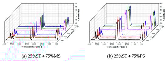 Based on the reasonable mixing ratios for the MS-ST and PS-ST mixtures, the FTIR analysis and testing are performed. Figure 11 shows the FTIR absorption spectra of the produced gases evolved from the reaction process of 25%ST + 75%MS and 25%ST + 75%PS, respectively. The FTIR spectrum information of gas species is obtained by online monitoring at the whole reaction temperature range (50–1200 °C). The infrared spectral data under six characteristic temperatures (in the pyrolysis process: TP−i, TP−p, TP−f; in the gasification process: TG−i, TG−p, TG−f) is displayed. Similar trends for 25%ST + 75%MS and 75%ST + 25%PS under these temperatures are shown. In the CO2 atmosphere, C=O bonds (726–586, 2400–2250 cm−1), which are the main functional groups and represent CO2, are clearly observed [11]. At the low-temperature pyrolysis stage, there exist some obvious peaks in the range of 3500–4000 cm−1, which represents H2O from the volatilizes. C=O bonds (about 2240–2060 cm−1) can also be clearly observed, indicating a higher existence of CO species [26]. CO is produced by the low-temperature pyrolysis reaction and the high-temperature gasification reaction (Boudouard reaction CO2 + C → CO). Notably, 75%ST + 25%PS presents more intense absorption spectra than 25%ST + 75%MS, indicating that more CO is produced in the 25%ST + 75%PS. This is because the 25%ST + 75%PS contains more volatile and fixed carbon contents in the samples.