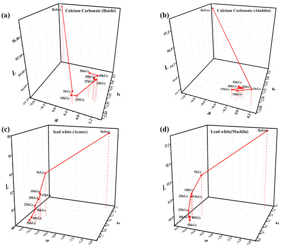 In order to explore the cause of the discoloration of calcium carbonate (Baishi) and lead white (Acmec) at 10 kGy, calcium carbonate from Aladdin Reagents and lead white from Macklin were purchased for comparative analysis. In the subsequent irradiation experiments at 5~50 kGy, four white samples were analyzed.