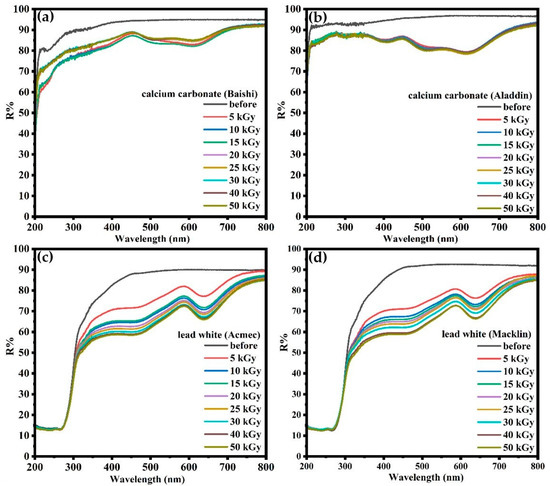 UV-Vis diffuse reflectance spectra of the calcium carbonate from (a) Baishi and (b) Aladdin and lead white from (c) Acmec and (d) Macklin within 1 d after 0~50 kGy irradiation.