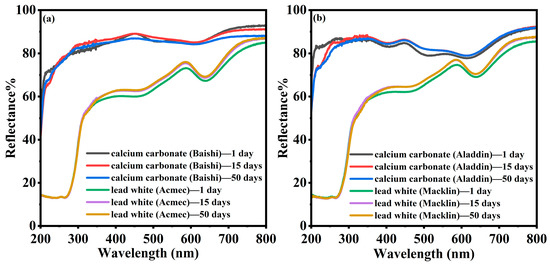 Comparison of diffuse reflection spectra of 30 kGy-irradiated calcium carbonate [(a) Baishi and (b) Aladdin] and lead white [(a) Acmec and (b) Macklin] samples stored for 1~50 days.