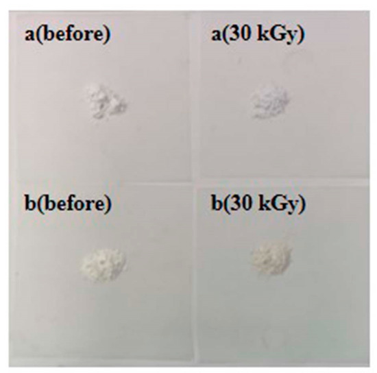 Figure 5 shows the changes in the calcium carbonate (Baishi) and lead white (Acmec) after 30 kGy irradiation. There was optical variation, as mentioned above, with bluish and yellowish changes emerging on calcium carbonate and lead white, respectively. Further, there was a noticeable degradation in the brightness of the above two pigments after irradiation.