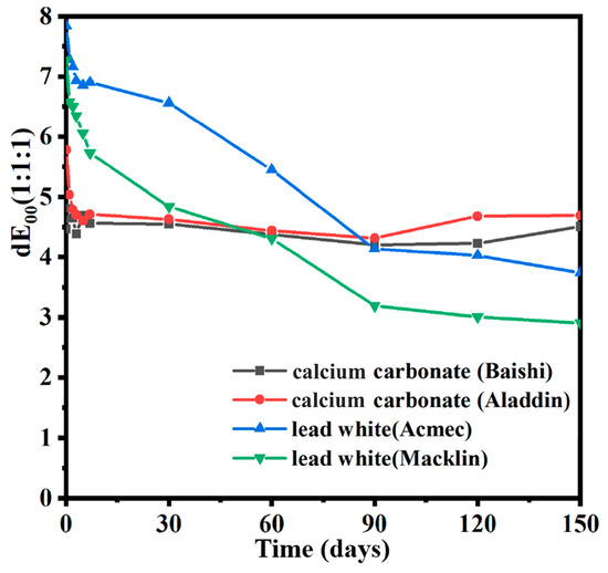 Figure 6 exhibits the stability of color changes for the four samples irradiated at 30 kGy. For the two calcium carbonate samples, no significant changes could be detected between 1 day and 150 days. However, values at 150 d for the two lead white samples decreased by more than 50% compared to 1 day. Based on the findings above, better time stability of color changes of the two calcium carbonate-containing samples was obtained. Owing to the worse stability, the color difference of the two lead-containing samples began to be lower than that of the two calcium carbonates after 60 days. Overall, up to four months at room temperature did not make the color difference of all four samples indistinguishable, as chromatic variation values of these samples were still higher than 1 after 150 days, and the color difference value stabilized after 90 days. Investigations into the stability of color changes of such carbonate-based white pigments have also been discussed in other papers. According to Negut et al. [7], the stability of color changes of marble dust irradiated by gamma rays at 26 kGy remained good, with no recovery of its initial color despite a year of storage at room temperature. Meanwhile, the color shifts of flake white historical dropped to 1 within 90 days. According to the same decreasing trend of the color of two lead white samples in our experiments, the value of chromatic variation will drop to less than 1 with enough storage time provided.