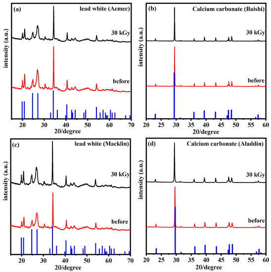 XRD spectra of lead white from (a) Acmec and (c) Macklin and calcium carbonate from (b) Baishi and (d) Aladdin before and after irradiation.