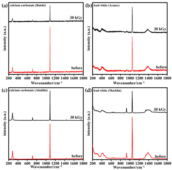 Figure 8 gives the Raman spectra of irradiated and unirradiated samples. Three peaks with signals at 281, 711 and 1086 cm−1 represent the stretching vibration of the C-O within the calcium carbonate from both Baishi and Aladdin, while a signal at 1049 cm−1 of the two lead white samples represents the stretching vibration of the carbonate ion [32,33]. The unchanged positions of Raman peaks equally indicate the stable structure of the four samples after irradiation. Moreover, decreased peak intensities suggest that the electron redistribution on the strength of the photon–phonon coupling was influenced [34].