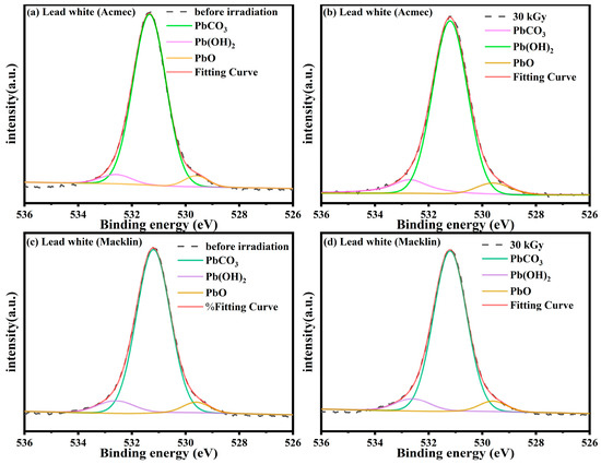 The XPS spectra of the O1s of the two lead white samples before and after irradiation are shown in Figure 9. The XPS map of lead white is divided into three forms of Pb, and the red line is the result of fitting three speculated forms. By comparing with the original map, it is reasonable to determine that PbCO3, Pb(OH)2 and PbO are the three substances with peak. The XPS spectra of the two lead white samples are consistent with the characteristics of basic lead carbonate. The signal peaks of the samples at 531.3 eV and 532.6 eV stand for PbCO3 and Pb (OH)2, respectively [35]. Furthermore, a peak at 529.6 eV representing the PbO signal was also found in the two lead white pigments. In previous studies, the signal at 529.6 eV was generally not observed in the pre-irradiated lead white, but was more pronounced in the post-irradiated ones [35,36]. Since no alteration in the intensity of the O1s signal of the lead white samples was detected after irradiation, it was concluded that no morphological changes emerge in the sample during irradiation.