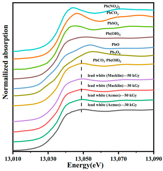 The XANES measurements were taken at the Beijing Synchrotron 1W1B Experimental Station. Test standards include PbCO3•Pb(OH)2, PbCO3, Pb(OH)2, Pb3O4, Pb(NO3)2, PbO, PbSO4 and pigments of lead white (Acmec and Macklin) after 30 and 50 kGy irradiation. The pigments and standards used in the tests were collected using transmission mode. The data of the samples were processed with Athena software for energy correction, normalization and background deduction.