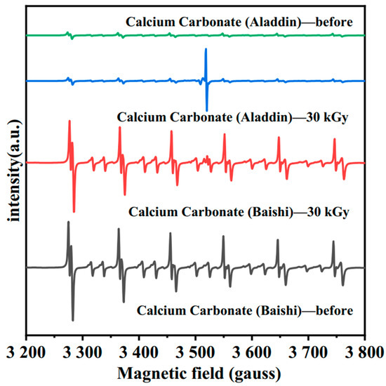 EPR spectra of calcium carbonate from Baishi and Aladdin before and after 30 kGy E-beam irradiation.