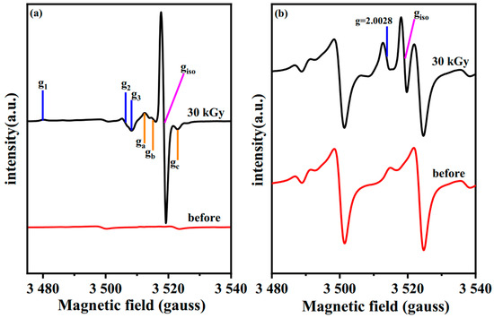 As shown in Figure 12, signals of two calcium carbonate-containing samples were finely scanned between the third and fourth lines of Mn2+. According to Figure 12a, distinct isotropic paramagnetic defects with g = 1.9998 appear in the irradiated calcium carbonate (Aladdin). Compared with previous research, such an isotropic defect at g = 1.9998 may be formed by an electron trapped in a CO2− vacancy during the grinding of calcium carbonate, which is also denoted as an F+ center [38]. Meanwhile, two groups of anisotropic radicals also appeared on the irradiated calcite, one identified as CO2− orthorhombic with g1 = 2.0033, g2 = 2.0017and g3 = 1.9974, while the other group was classified as CO3− orthorhombic with g1 = 2.0217, g2 = 2.0071 and g3 = 2.0057. Both of the above paramagnetic defects have been found in calcium carbonate which irradiated with gamma [39], UV [40] and X-rays [38]. In Figure 12b, a similar approach was also analyzed for calcium carbonate from Baishi treated at 30 kGy. It is clear that the isotropic defect at g = 1.9998 still appears, and although the intensity of the signal here is not as strong as that of its reference sample, it still belongs to the same color center generated during grinding.