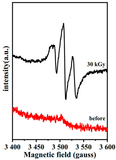 Despite the absence of Mn2+ impurities in the sample, peaks around g = 2 were still found in the white lead (Acmec) after E-beam irradiation, as seen in Figure 13. The paramagnetic defects of the irradiated lead white from Macklin were consistent with the lead white from Acmec, with three overlapping peaks. Limited by the current detection conditions, the separation and characterization of the above three peaks seem infeasible. Therefore, combined with previous studies, the value of g-factor approaching 2 indicates that unpaired electrons are captured after electron beam irradiation. This electron–electron defect state causes a change in the color of the two types of lead.