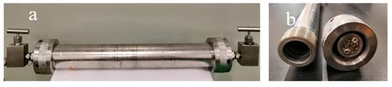 The crude oil used in the experiment was taken from the Shengli oil field, with a reservoir permeability of 2000–4000 mD. Its viscosity at 50 °C was 1760 mPa·s and density was 947.8 kg/m3 after degassing. The gas used in the experiment was flue gas, consisting of N2 and CO2 with 99.9% purity (Qingdao Tianyuan Gas Manufacturing Company, Qingdao, China). The volume ratio of N2 to CO2 was set to 4:1, with reference to the gas components emitted from the oil-field steam boiler [18]. The water used for steam production in the experiment was ultra-pure water after the ion-removal treatment of the water purifier, with a resistivity of 15 MΩ·cm. The sandpack models in the experiment were filled with 80 mesh and 120 mesh quartz sand at a 1.5:1 mass ratio; its physical parameters were basically the same, with a permeability of about 2600 mD and a porosity of about 44%, as shown in Table 1. The permeability of the sandpack refers to the ability of the model to allow fluid to pass axially under a certain pressure difference, and is a parameter that characterizes the ability of porous media to conduct liquid.