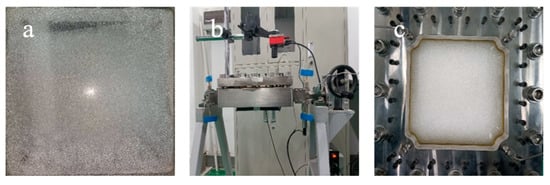 The experimental device for the flow characteristics of flue gas-assisted steam flooding was composed of an injection system, porous media models, and a data processing and acquisition system. The injection system could inject three fluids—gas, steam, and liquid—into the porous media model. During the gas injection, the high-pressure flue gas stored in the piston container (model 1.5 L, Jiangsu Hai’an Petroleum Technology Instrument Co., Ltd., Hai’an, China; pressure range of 0.1–32 MPa; temperature range of 0~200 °C) was injected into the porous media model at a specific flow rate after passing through a gas mass flowmeter (model Sla5861, Brooks, Seattle, WA, USA; flow control range of 0–20 mL/min; accuracy of 1% of the full range). During the steam injection, deionized water was pumped by a high-precision plunger pump (Model 100DX, Teledyne Co., Ltd., Thousand Oaks, CA, USA; flow accuracy < 0.25 μL/min; pressure accuracy of ± 0.5%), which provided power and was fired by a steam generator (model GL-1, Haian Petroleum Equipment Company, Nantong, China; temperature range of 100–350 °C; pressure range of 0.1–25 MPa) to meet the experimental requirements, and then flowed into the porous media model. In order to ensure the quality of steam flowing into the model, the pipeline between the steam generator and the seepage model was wrapped in a heating belt with a controllable temperature. During the liquid injection, crude oil and water were, respectively, stored in the piston container and pressurized by the piston pump; they then flowed into the model. The porous medium models included a one-dimensional sandpack (see Figure 1) and a two-dimensional microscopic visualization model. The main body of the microscopic visualization model (customized, Tuochuang Scientific Research Instrument Co., Ltd., Nantong, China; temperature range of 0–280 °C; pressure range of 0.1–3 MPa) was composed of two quartz glass plates at the top and bottom. There was a hole through the glass at each of the four corners of the glass plate, which could be used as the injection end and the extraction end, as shown in Figure 2a. Porous media with different pore throat structures could be simulated by laying glass beads between the two glass plates with heat-resistant waterproof double-sided adhesive, which were then sealed with high-temperature graphite, clamped, and fixed onto two hollow metal frames, as shown in Figure 2b,c. The length and width of the visible area of the micro-visualization model were both 25 cm and the thickness of the filled glass microspheres was less than 1 mm, which greatly increased the transparency of the model and facilitated the observation and capture of details during the flow process. The data processing and acquisition system consisted of two modules: a liquid production collection device and a real-time image collection device. The liquid production collection device was used to record the characteristics of oil and water production during the whole experiment and a temperature gun (Model DT-8867H, Huashengchang Technology Co., Ltd., Shenzhen, China; temperature range of −50–1650 °C; measuring accuracy of ± 1.0%) was used to record the temperature at the inlet and outlet of the sandpack. In the process of the microscopic visualization experiment, a high-definition digital camera was used to record the flow characteristics of the flue gas and steam. A schematic of the experimental devices is shown in Figure 3.