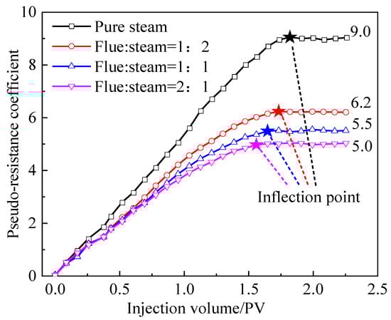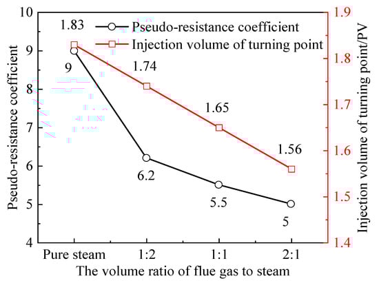We compared the mobility stability time for a mixed steam flow with different flue gas contents, as shown in Figure 5. In the pure steam displacement, when the fluid injection volume was 1.83 PV, the mobility tended to be stable. When the volume ratio of the flue gas to steam was 1:2 and the injection volume was 1.74 PV, the mobility tended to be stable and the stabilization time gradually advanced with an increase in the flue gas ratio. When the ratio of flue gas to steam was 2:1, the stabilization time was 1.56 PV. This showed that the existence of flue gas helped to accelerate the flow of steam in the reservoir and accelerate the displacement stability. This phenomenon intensified with an increase in the flue gas content.