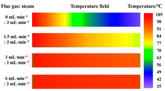 The temperature field could reflect the flow state of steam in porous media. Figure 6 shows the distribution of the temperature field of flue gas-assisted steam flooding with different contents during the evaluation of flow capacity. The left side of the sandpack model was the inlet of the fluid and the right side was the outlet. At the end of the displacement, it could be seen that the temperature at the left end of the model was high; the temperature sharply dropped at the in the left third of the model position and the latter half was basically below 50 °C. With the flue gas-assisted steam flooding, the distance of heat transmission significantly increased; the position of the temperature reduction shifted to the right and changed from a sudden drop to a slow drop. When the ratio of flue gas to steam was 2:1, the temperature at the end of the model outlet was close to the inlet and the overall color was red. At the same time, according to the distribution of the temperature field, the fluid state in the core pipe after stabilization during the steam drive could be divided into three types: the steam section; the steam liquefaction section; and the saturated water section, of which the liquefaction section was the main part. With the flue gas-assisted steam flooding, under the effect of the flue gas, the gas–liquid two-phase flow at the front end of the model was converted into a gas–steam flow and the distance of the steam flow in the vapor state was lengthened. After stabilization, there were only the gas–steam section and the steam liquefaction section. This was the reason that the steam flow resistance decreased after flue gas was added, as shown in Figure 4 and Figure 5.