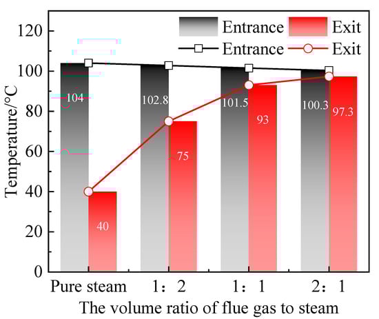 In order to quantitatively compare the influence of flue gas on the steam heat transfer effect, the specific temperatures at the inlet and outlet of the sandpack in the four groups of displacement experiments were recorded. Combined with Figure 7, it was found that at the end of the experiment, as the proportion of flue gas increased, the temperature at the inlet of the sand-filled pipe slightly decreased from 104 °C to 100.3 °C whereas the outlet temperature significantly increased, in contrast to the pattern presented by the inlet. During the pure steam displacement, the outlet temperature was only 40 °C. With the increase in the proportion of flue gas in the injected fluid, the higher the outlet temperature was, reaching 97.3 °C, which was only 3 °C from the inlet. This phenomenon was due to the strong seepage ability of the flue gas, which was prone to a fingering phenomenon, so the steam reached the outlet faster. The existence of flue gas could inhibit steam condensation near the inlet, strengthen the heat transfer in the deep part of the reservoir, reduce steam heat loss [41], and make the heat of the steam spread to a deeper formation.