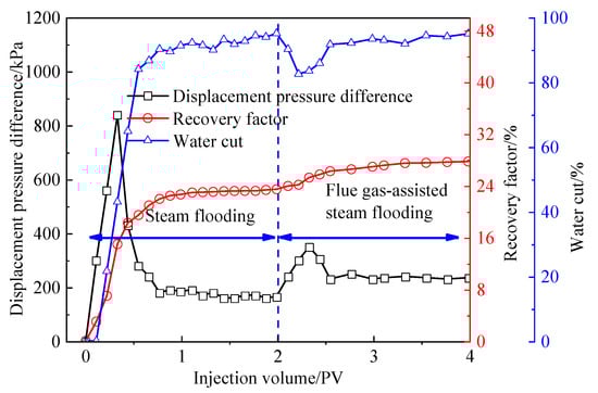 Figure 9 shows the dynamic oil displacement characteristics during steam flooding and flue gas-assisted steam flooding. The black line in the figure represents the change of the displacement pressure difference with the injection volume and the red line represents the change of the recovery degree with the injection volume. It can be seen from the figure that in the steam flooding stage, with the injection of high-temperature steam, the recovery factor of heavy oil continued to increase. When the steam injection volume reached 1.1 PV, the cumulative recovery factor was 23.5% and the heavy oil recovery rate remained basically unchanged. At the same time, the displacement pressure difference in the model rapidly rose at the beginning of the steam injection because the heavy oil saturated in the model had a high viscosity and poor flow ability, which required a high displacement pressure to push the heavy oil forward. When the steam injection volume was 0.3 PV, the displacement pressure difference inside the model was 840 KPa. When the steam injection volume reached 1.2 PV, the displacement pressure difference inside the model was basically stable at 165 KPa.