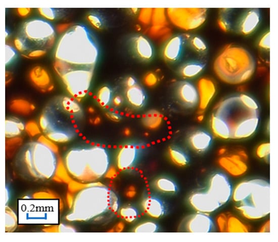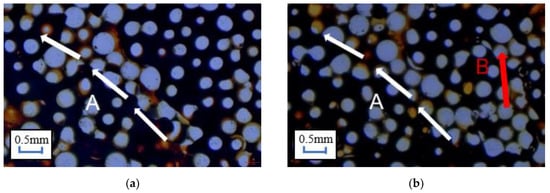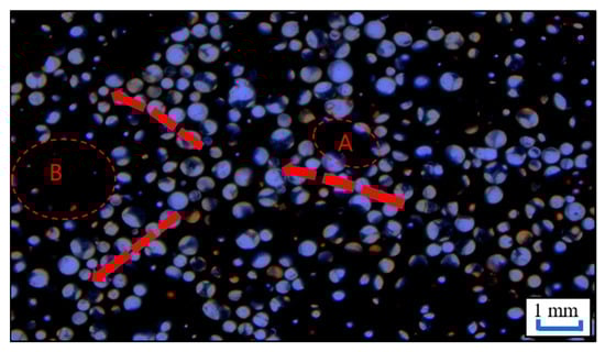 Figure 11 shows the typical micro-distribution of oil and water in the thermal swept area after the completion of pure steam displacement, in which the black area is heavy oil, the white bright area is the steam displacement part, and the round spherical spots are filled glass beads. It can be seen from the figure that after the steam flooding, the remaining oil was distributed in the model in two forms: one was the corner remaining oil formed by incomplete steam or condensing hot water flooding due to the difference in oil–water viscosity [42] as shown in area A in Figure 11; the other was the blocky remaining oil formed by the steam bursting in the direction of least resistance along the course under the displacement, avoiding the area of higher resistance [43], as shown in area B in Figure 11. The former was related to the oil layer wettability and pore throat structure; the surface of the double-sided adhesive used in the experiment was lipophilic and the glass beads were randomly distributed on the double-sided adhesive during the modeling process. The latter was related to the microscopic heterogeneity of the pore structure, leading to the bypassing of the steam through the area of patches of small pore channels with high resistance.