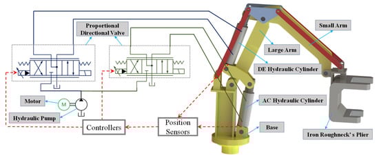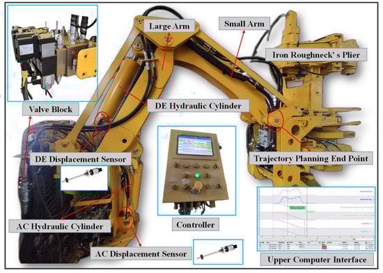 An iron roughneck is a multi-functional, safe, and efficient drilling tool that mainly installs/uninstalls a drill pipe joint, dumps the drill pipe and moves downhole tools [1]. An iron roughneck mainly consists of an actuator and an electrohydraulic servo system. Its actuator mainly consists of a clamp head and mechanical arm. This study addresses the mechanical arm of an iron roughneck and its electrohydraulic servo system. Electrohydraulic servo systems have been widely used in many fields, such as the aerospace, robotics, and construction industries, because of their small size, light weight, fast response, and high accuracy [2,3]. Hydraulic position control systems are widely used in hydraulic actuators as one of the electrohydraulic servo systems [4,5]. Current research on iron roughnecks mainly focuses on the design of actuators and neglects the electro-hydraulic servo systems. Iron roughnecks usually work under high load conditions and require high accuracy; therefore, electrohydraulic proportional position control systems are well suited for iron roughnecks.