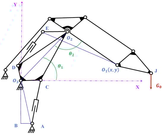 Equations (1)–(4) are the kinematic positive solution formulae, where the displacements of the two hydraulic cylinders are and , given the length of the two hydraulic cylinders, to obtain the coordinates of point .