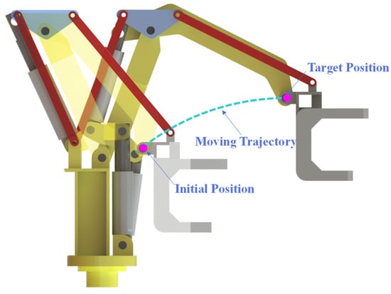 The role of the MAIR is to smoothly send the pincer head to the target position; the actual work should ensure that the running trajectory of the pincer head is as smooth as possible. According to the operating conditions, the trajectory of the MAIR in the working space is designed as a circular arc, and the highest point of the circle is taken as the target point of the iron roughneck, because the rate of change in the iron roughneck in the Y-direction at this point is zero. This can ensure that the end of the iron roughneck reaches horizontal. The radius of the arc was set according to the starting point to ensure that both the starting and target points were on the same arc. The running trajectory at the end of the iron roughneck is shown in Figure 3.