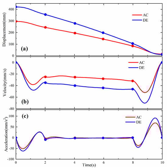 Trajectory of the joint space of the hydraulic cylinder after interpolation. (a) Displacement curves for trajectory planning; (b) velocity curves for trajectory planning; (c) acceleration curves for trajectory planning.
