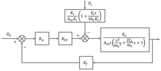 Equation (18) shows that the output displacement of the iron roughneck-driving hydraulic cylinder is affected by the servo-valve opening and external load. When the external load , only changing the external load to constitute different servo systems and adapting to different linear joint requirements, such as the up and down swing of the iron roughneck’s big arm and the back-and-forth swing of the small arm, are necessary, all of which can be dynamically analyzed on this basis. For , the servo-valve spool opening directly determines the output displacement of the hydraulic cylinder. The hydraulic valve-controlled system is a third-order system consisting of an integral link and a second-order oscillating link, and there is a case where the pole = 0. In this case, the pole is not all in the negative axis, which may be an unstable system. According to the stability criterion of the hydraulic position control system in reference [33], from , it can be seen that the stability condition is satisfied according to the characteristic parameters of the system calculated. Therefore, this hydraulic position control system is stable. A square diagram of the closed-loop system is shown in Figure 7.