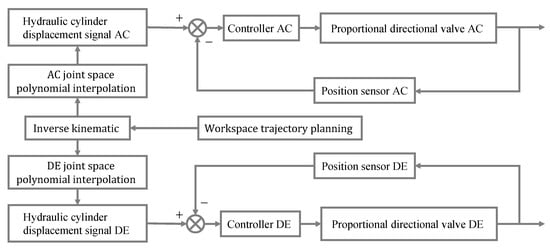Figure 1 shows a schematic of an MAIR, including the movable arm mechanism and corresponding hydraulic system. The MAIR has two degrees of freedom and is driven by two hydraulic cylinders. The position of the clamp head in the working space is determined based on the displacement of the hydraulic cylinders. The operating speed of the hydraulic cylinder is related to the flow rate, which is controlled by a proportional directional valve. The hydraulic cylinders are equipped with displacement sensors, which input the displacement signal to the controller. The controller processes the displacement error and outputs the control signal. The flow of the hydraulic cylinder is adjusted by adjusting the valve opening of the proportional reversing valve and then controlling the speed of the hydraulic cylinder to realize its position control of the hydraulic cylinder.