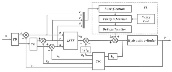 The principle of a TF-ADRC is based on an ADRC and introduces two tracking differentiators to realize the tracking of discontinuous signals, extract the error, error change rate, and error change acceleration rate, and uses linear error feedback to improve the response speed. By combining fuzzy control and an ADRC controller, the output signal of the controller is dynamically compensated for by the displacement deviation, displacement deviation change rate, and displacement deviation change acceleration rate of the hydraulic cylinder. The system parameters have the characteristics of a ‘large error, large compensation’ and ‘small error, small compensation’. The entire control system has higher robustness and faster response speed. Figure 10 shows the principle of the TF-ADRC. The design of the controller includes the fuzzy link and the ADRC design of the three-dimensional input.