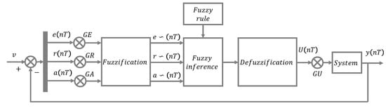 In Equation (21), is a positive integer; is the set target value, which can be the displacement; is the sampling period; and , , , , and are the error, error rate of change, error rate of change acceleration, system output, and fuzzy controller output at sampling moment , respectively. , , and denote the sampling values at the moment. GE, GR, GA, and GU are the error gain, error change rate gain, error change acceleration rate gain, and output gain, respectively. denotes fuzzification, denotes the controller output increment, and the fuzzy controller sets the exact output increment at the moment. , , and are the fuzzy set pairs of , , and responses, respectively.