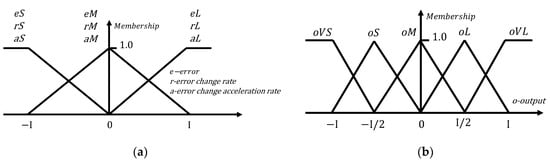 Fuzzification needs to be realized by the affiliation function, and here, a simple triangular affiliation function was used to define the fuzzy subsets of the input quantities as small (S), medium (M), and large (L), and the fuzzy subsets of the output quantities as very small (VS), small (S), medium (M), large (L), and very large (VL). The input and output incremental fuzzification algorithms are shown in Figure 12.